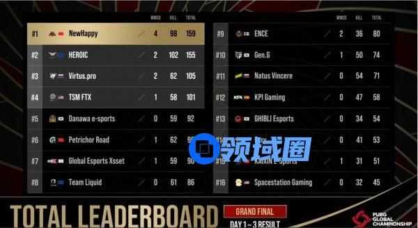 【Krafton Inc.旗下PUBG工作室】信者永恒,竞绽光芒!Krafton Inc. 旗下PUBG工作室举办的PGC 2021(PUBGGLOBALCHAMPIONSHIP 2021,简称“PGC 2021”)终极之战——总决赛的征程在本周热血启航!来自PCL赛区的NH战队在总决赛的舞台上尽显锋芒,在最后一天反超比分,凭借4鸡98个淘汰159分的成绩,荣获PGC 2021全球总冠军的称号,让属于中国的奇迹红闪耀世界赛场!HERO战队也展现出超乎寻常的状态与无可匹敌的作战能力,以2鸡102个淘汰155分的成绩收获亚军。VP战队在最后一天后来居上,以2鸡62淘汰105分获得季军。TSM战队发挥平稳,以101分位列第四。DNW战队则以92分排在第五。另一支PCL战队PeRo战队以90分名列第六。台湾战队GEX以淘汰数劣势获得第七。KX战队凭借倒数第二局的吃鸡拿下了第15名的成绩。