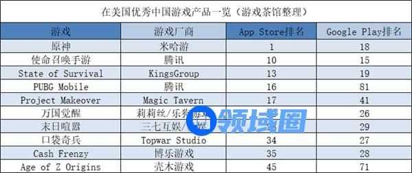 在本期榜单上,《原神》与《State of Survival》分别是出海美国和德国游戏中收入最高的。其中《原神》在美国App Store畅销榜上排名第一。