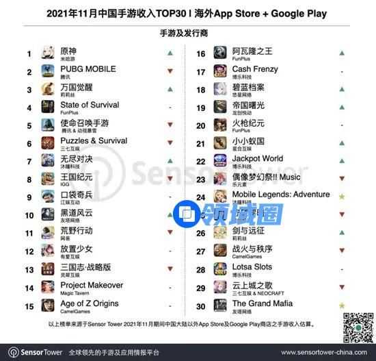 Sensor Tower的数据显示,《原神》在11月初上线了2.3新版本并加入了新角色。《原神》手游在海外收入环比增长60.5%,并成功成为11月出海手游中收入最高的。