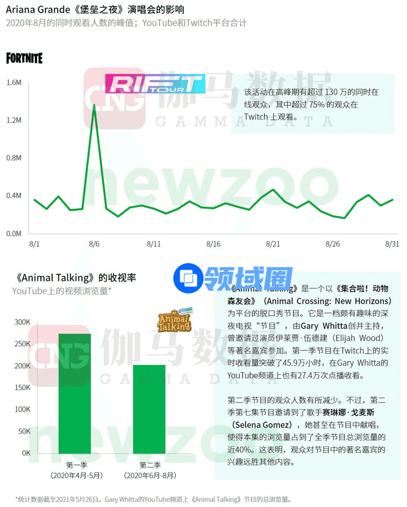 · 得益于《堡垒之夜》虚拟音乐会的影响,在演出结束后,Ariana Grande在《堡垒之夜》内演唱的歌曲在各大音乐、视频平台上的播放量大增。这些增长主要是由她的《Be Alright》曲目带来的,该曲目在2021年8 月 5 日(《堡垒之夜》活动前一天)至 8 日之间的播放量增加了 123%*。