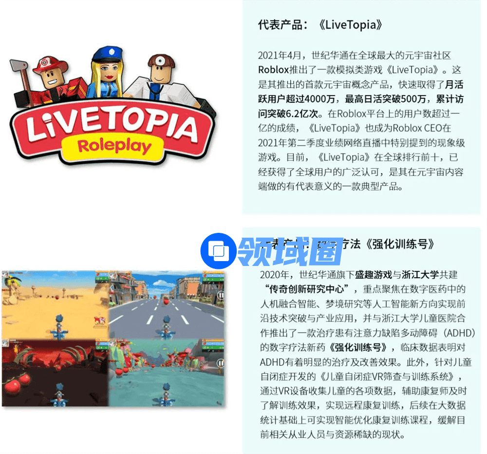 世纪华通在与元宇宙相关的产品内容、脑科学、AR/VR、云游戏等领域均有所布局,为元宇宙生态的发展从技术、商业合作等各层面进行尝试和拓展,触达更多元宇宙领域。在产品内容上,世纪华通强化自研产品《LiveTopia》在全球范围已取得一定成绩;在脑科学层面,世纪华通重点布局“数字孪生”领域,旗下产品在治疗失眠、儿童注意缺陷与多动障碍均获得了阶段性成果;在AR/VR、云游戏等领域,世纪华通通过商业合作的形式链接产业链上下游,借助投资方式扩大元宇宙相关业务布局,以实现全链路的技术输出和多领域技术协同。