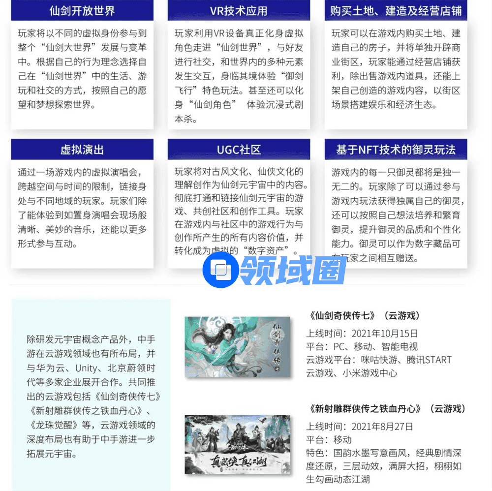 作为以IP战略为核心的游戏企业,中手游也将IP赋能元宇宙的发展,并打造首个国风文化元宇宙“仙剑元宇宙”:《仙剑奇侠传:世界》。该产品按照数字孪生、虚拟原生、虚实融生三步规划,现已经具备了元宇宙的基本核心特征:跨终端随时随地加入、沉浸式体验、虚拟身份、强社交性、自由创造、经济系统。游戏玩法中包括大量UGC生态内容,并向玩家粉丝提供低门槛的UGC编辑器,玩家可以自由创作专属于自己的内容。而玩家在游戏内与社区中的游戏行为与创作所产生的所有内容价值,还都将转化成为虚拟身份的“数字资产”。