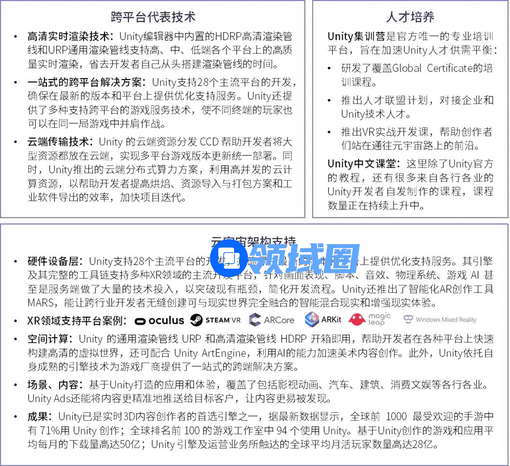 · 在元宇宙架构支持层面,Unity在多个相关维度具备技术支撑,并且持续探索元 宇宙的关键技术,从原生平台开发、接口开放等多维度提供完整的工具链,在XR生态、引擎技术、云端算力等方面提供技术支持。