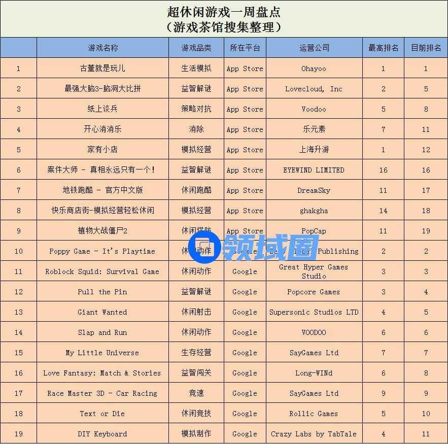 超休闲游戏方面,在App Store免费游戏榜单,Ohayoo新游《古董就是玩儿》空降榜首,解谜玩法的《最强大脑3-脑洞大比拼》和Voodoo的《纸上谈兵》分别拿下榜单第2和第3名。在Google Play免费游戏榜单中,动作游戏《Poppy Game - It's Playtime》登上榜首,“鱿鱼游戏”玩法的《Roblock Squid: Survival Game》和益智游戏《Pull the Pin》分别位于榜单第2和第3名。