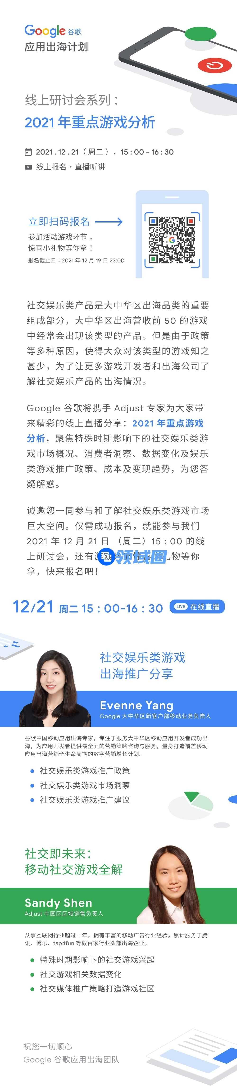 现在机会来了!Google 谷歌将携手 Adjust 专家为大家带来精彩的线上直播分享:2021 年重点游戏,聚焦特殊时期影响下的社交娱乐类游戏市场概况、消费者洞察、数据变化及赌博类游戏推广政策、成本及变现趋势,为您答疑解惑。