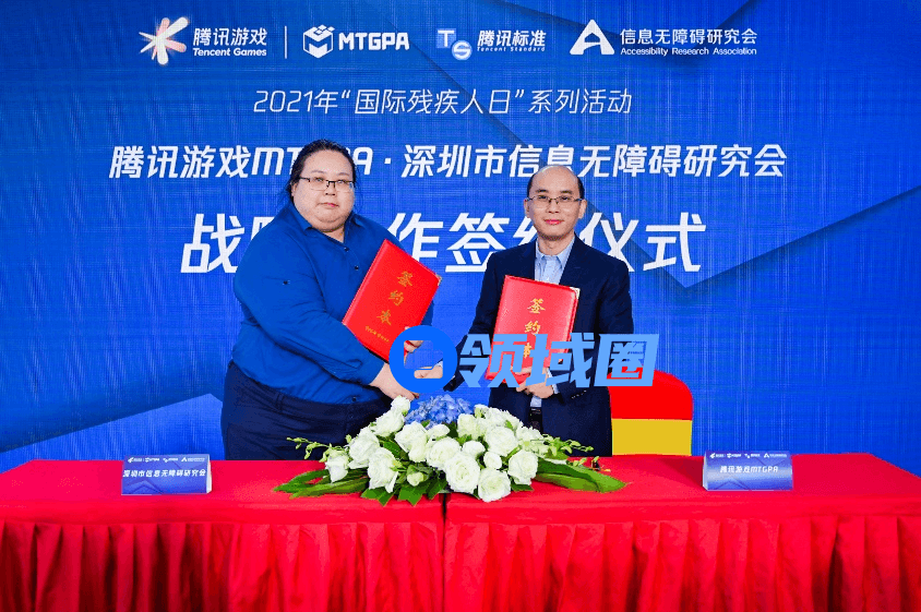 深圳市信息无障碍研究会秘书长杨骅(左)与腾讯游戏技术运营部总经理刘栖铜进行战略合作签约仪式