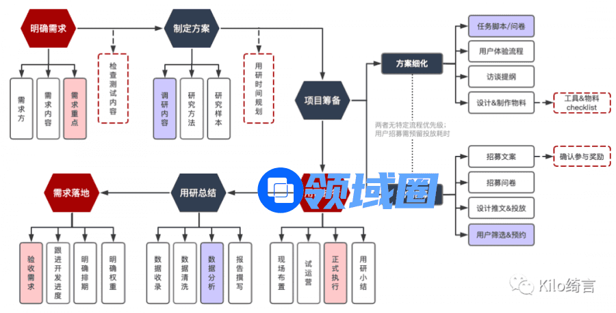 上图仅供参考,建议根据实际情况进行增减或工作排序调整。比如“用户招募”中,若已有储备的用户、且样本量也已满足用研需求,则可适当缩减或取消其中的部分流程。