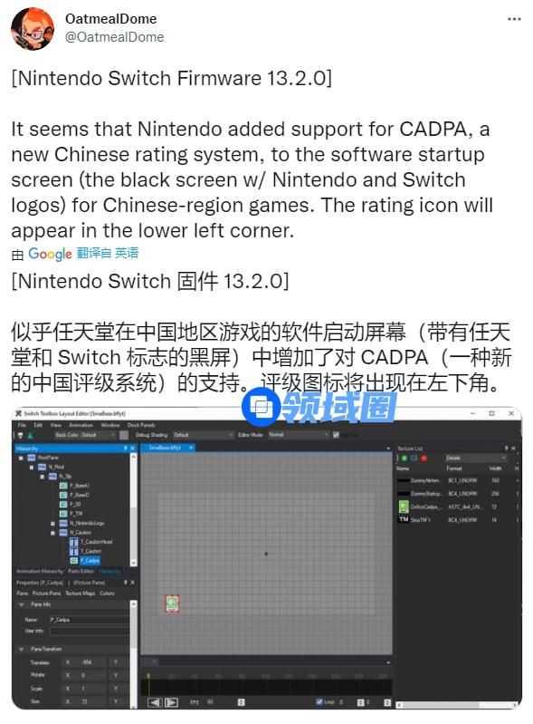 近日,外国网友OatmealDome在解包时发现,在NS主机13.2.0版本更新中出现了国内游戏年龄提示图标(出现在左下角),同时增加了对CADPA的支持。