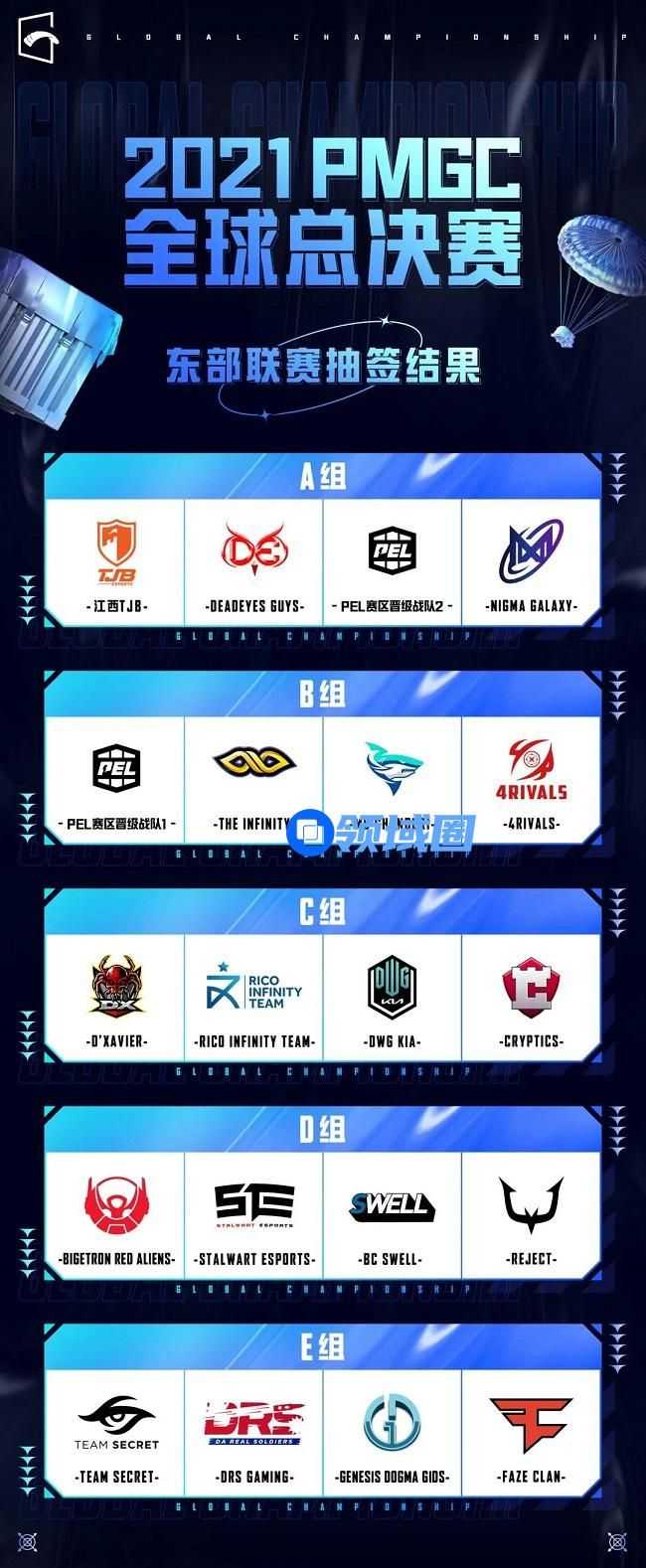 代表PEL出征本届全球总决赛的中国战队是2021 PEL S4赛季结束后年度积分排名前二的STE战队、NV腾讯视频战队以及TJB战队,东部联赛组别中,TJB与NV腾讯视频战队同属A组,同组有来自尼泊尔的热门团队DE和阿联酋的NGX。STE战队位于B组,同组有来自泰国的劲旅The Infinity目前世界排名第4,实力不容小觑,同组另外两队为首次参与全球总决赛的泰国队伍MSC以及马来西亚队伍4RIVALS。除此以外,东部联赛C组中世界排名第五的Faze Clan,D组中上届全球总决赛排名第5的Bigetron RA,以及E组中曾获上届排名第7的Team Secret都是不容忽视的对手。