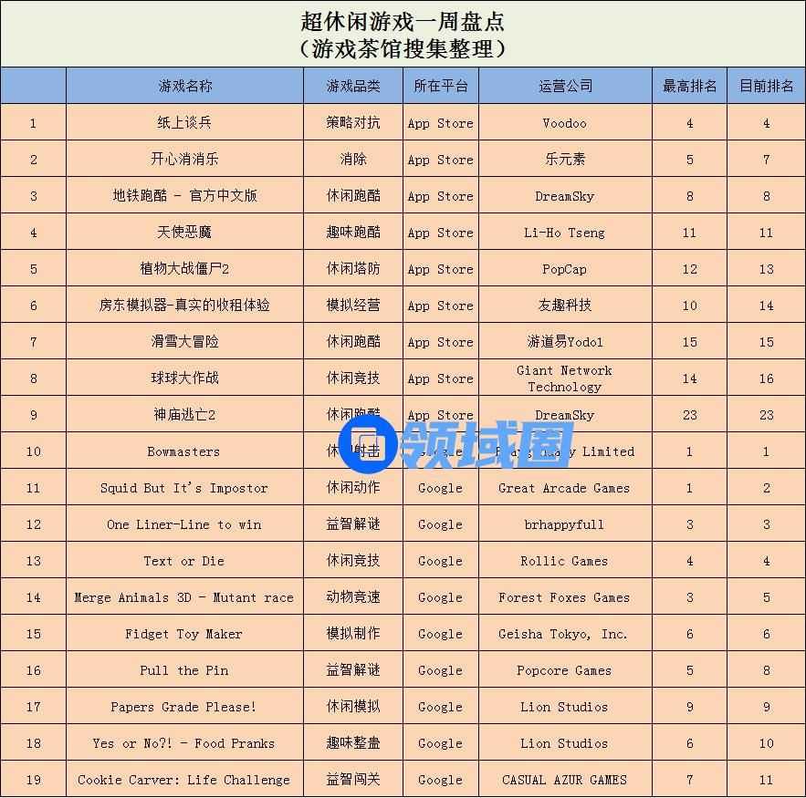 超休闲游戏方面,在App Store免费游戏榜单,Voodoo《纸上谈兵》再登榜首,乐元素《开心消消乐》和经典跑酷游戏《地铁跑酷 - 官方中文版》则分别拿下榜单第2和第3名。在Google Play免费游戏榜单中,射击玩法的《Bowmasters》登上榜首,《Squid But It's Impostor》和《One Liner-Line to win》当前则分别位于榜单第2和第3名。