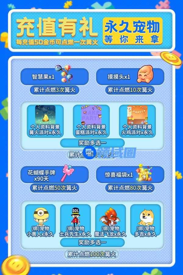 活动期间,让推理之都的篝火点亮整个夜空吧!每充值50金币可点燃一次“篝火”,并从“篝火派对抽奖池”中抽取1份装扮奖励!当您累计点燃100次“篝火”,即可从四款永久宠物中挑选一款,包含:小黄人、士兵先生、魔法飞龙和多吉!