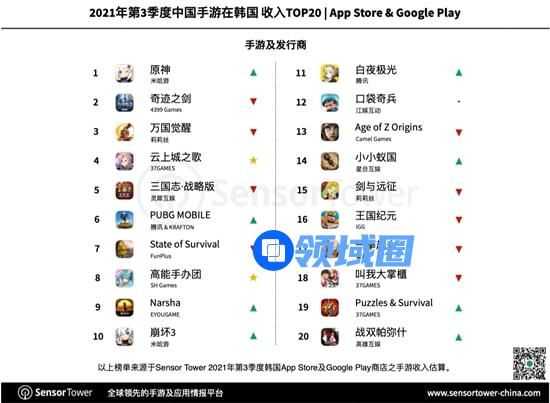 在本期榜单上,《原神》和《云上城之歌》分别是出海日本、韩国游戏中收入最高的。