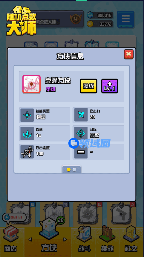 技能效果:攻击一定的次数后,克隆方块会在以自身为中心的九宫格空格内随机生成一个1星的克隆方块。
