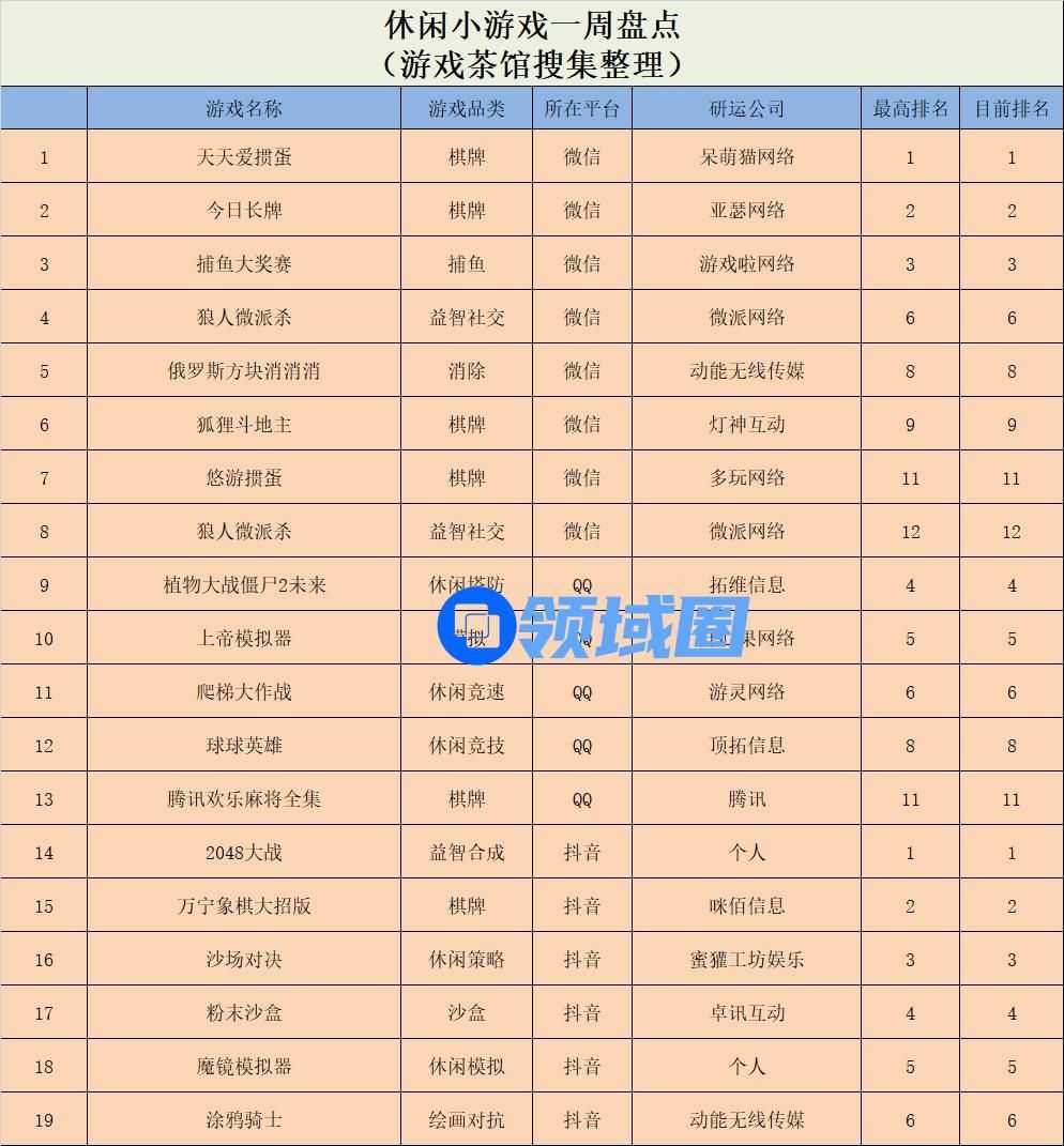 休闲新游周报每周统计微信小游戏、QQ小游戏、抖音小游戏以及App Store和Google Play上的新游爆款,并按照分类制作表格,将游戏排名情况等信息公布,希望给到行业同侪帮助。