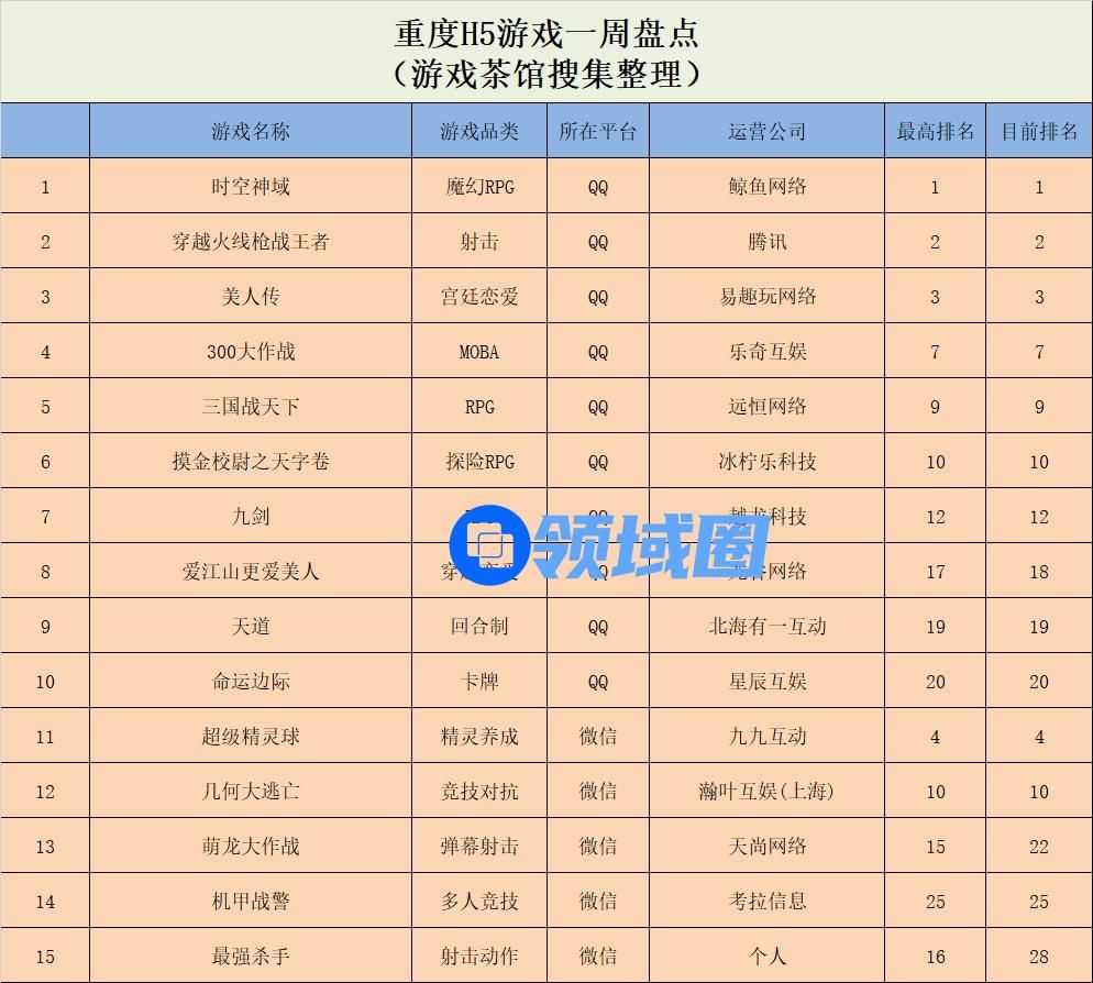 重度H5游戏:《时空神域》登顶榜首,《三国战天下》跻身TOP10