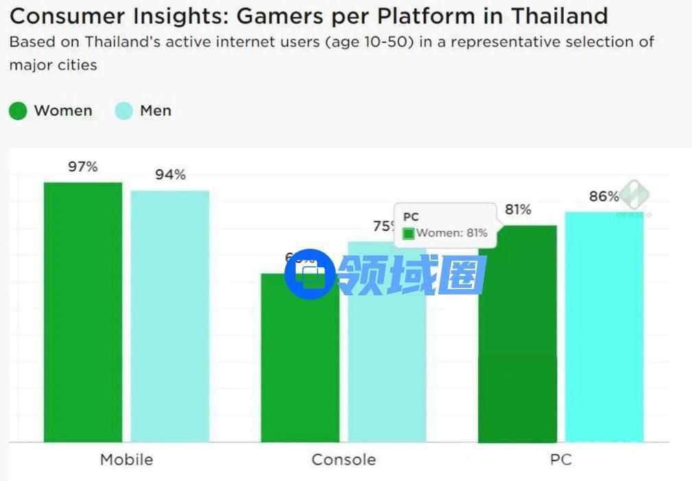 互联网和终端设备的高覆盖率,直接推动了游戏市场在泰国地区发展。据Newzoo统计,在泰国游戏市场中,有95%的玩家会使用手机玩游戏,有84%的玩家在玩PC游戏,还有69%的玩家在玩主机游戏,且泰国的女性玩家更爱通过移动设备进行游戏,男性用户则更偏向其他平台。