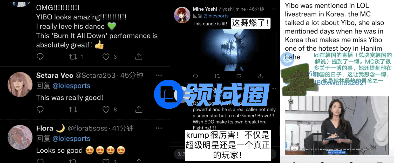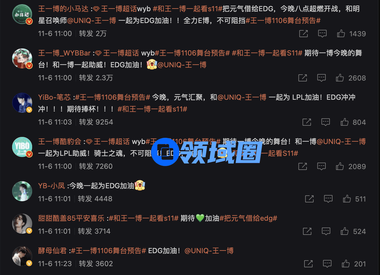 表演过程中,王一博精彩的舞蹈配合多届S赛的高燃主题曲,成功激起了国内外电竞爱好者们的热情。特别是王一博粉丝,更是在社交平台上向更多网友广泛安利英雄联盟S赛,用行动号召更多人的声音为EDG战队和LPL赛区加油助威。