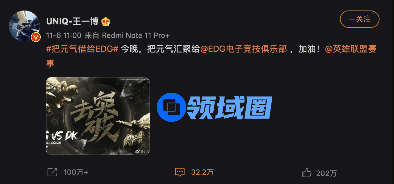 然而事实上王一博的影响力还不仅停留在赛事期间,在冠亚军决赛当日中午,王一博还在个人微博上发布助威内容,以邀请玩家一起为EDG战队聚集“元气”的方式发起声援,赢得了许多玩家及粉丝的响应。