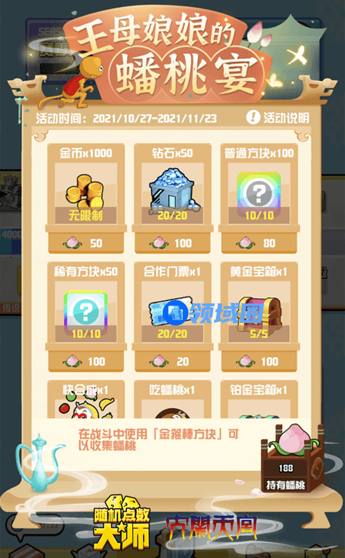 每日参与战斗,使用金箍棒方块即可获得特殊活动物品“蟠桃”,兑换稀有道具,收集方块宝箱,提升自我实力,畅享对战乐趣!