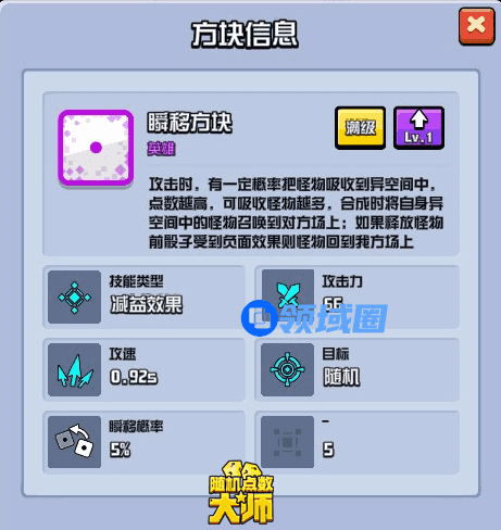 技能特点:瞬移方块点数越高,可吸收的怪物越多。合成时能够将自身异空间中的怪物召唤到敌方战场上;如果释放怪物前骰子受到负面效果的影响,怪物则会回到我方战场上。