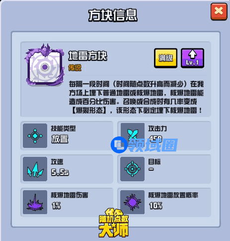 技能特点:核爆地雷能够造成百分比伤害,召唤或者合成时有几率变成“核爆形态”,该形态下必定会埋下核爆地雷。 随着点数的升高,埋下地雷的间隔时间会逐渐减少。