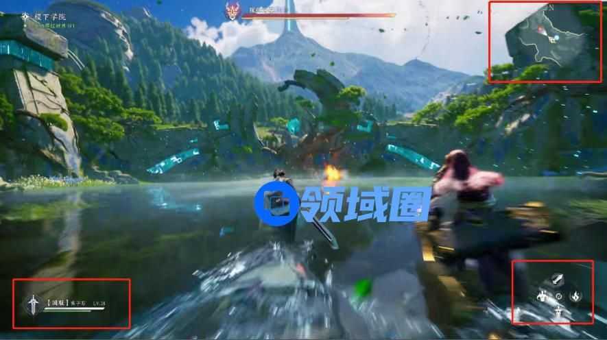 首先,在主角和红BUFF的战斗的时候,我们可以看到,人物的初始武器为长剑,在角色做出滑步、跳跃等动作时,左下角UI的绿色能量条会同步发生变化,应该是类似于体力值的设定。