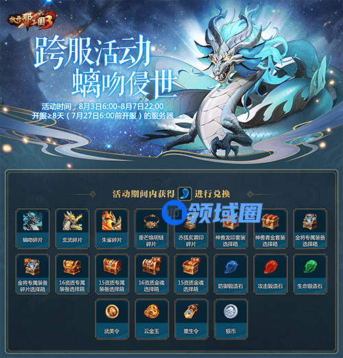 8月3日6:00-8月7日22:00期间,玩家参与跨服BOSS活动,单次攻打神兽达到指定伤害,可领取「勾玉」等挑战奖励。「勾玉」可在跨服BOSS活动商店中兑换传说中的上古神兽螭吻、玄武、朱雀的碎片、30品强力配饰碎片、金将专属装备选择箱等超值奖励!精兵利甲战意斐然,神兽相护战无不胜!
