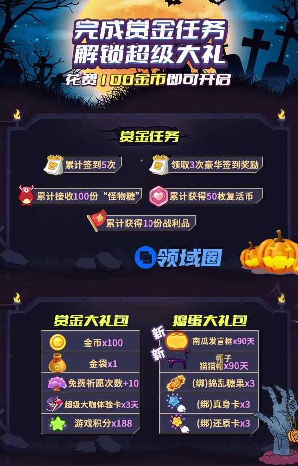 活动期间,花费100金币购买“捣蛋大礼包”,同时开启赏金任务,只要您在活动结束前完成所有赏金任务,即可抱走“赏金大礼包”!
