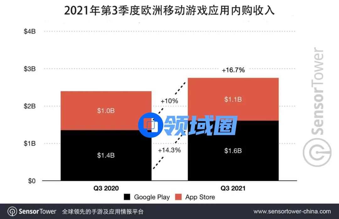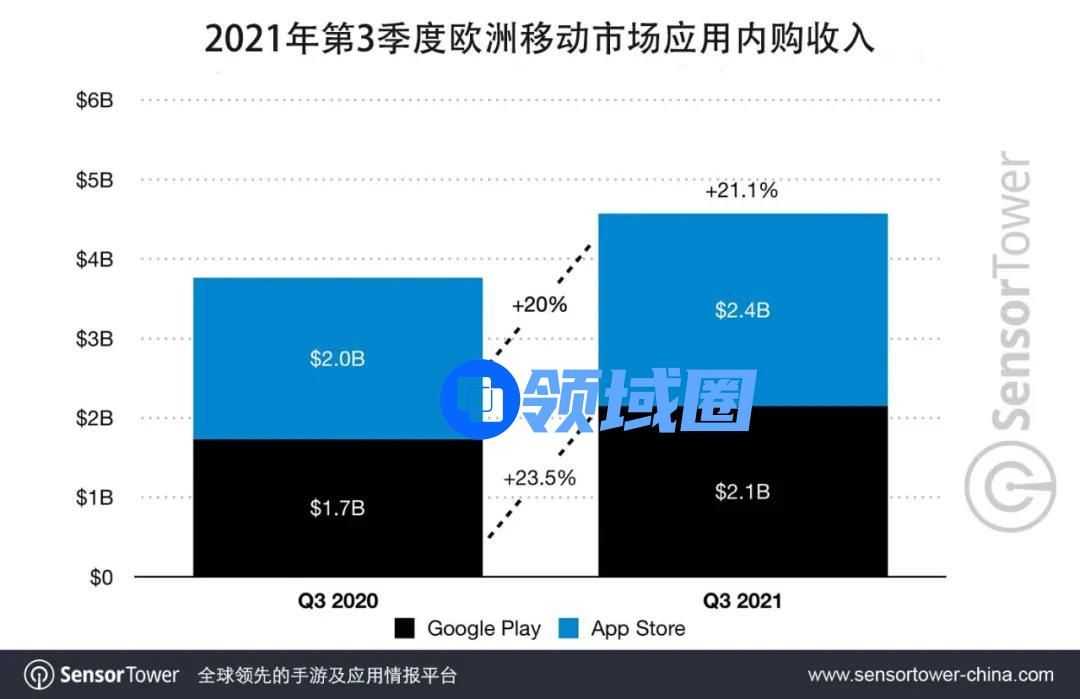 在欧洲移动市场,2021年第3季度苹果App Store贡献了超过24亿美元的收入,同比增长20%。与此同时,来自Google Play的收入超过21亿美元,同比增长23.5%。
