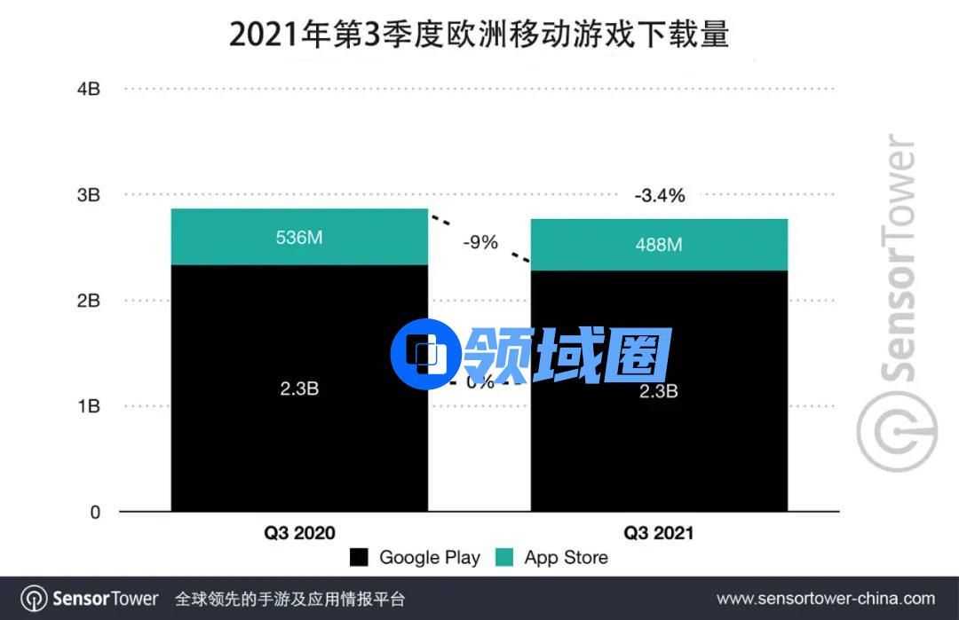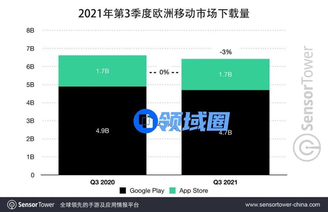 下载量方面,2021年第3季度欧洲App Store和Google Play共获得64亿次,同比下降3%。