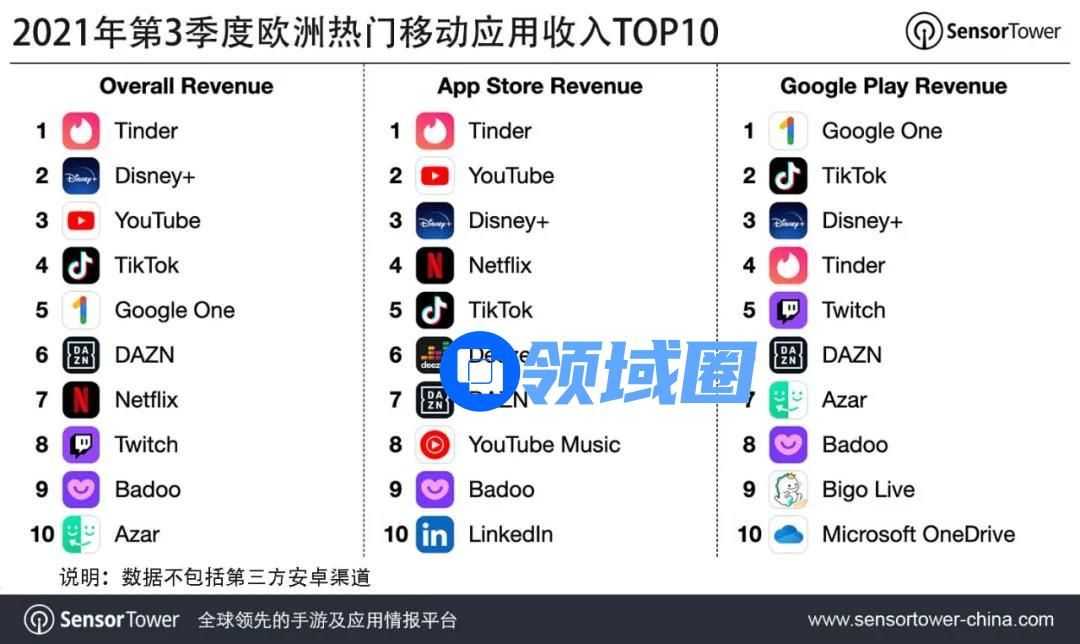交友应用Tinder以1.05亿美元应用内购收入,位列2021年第3季度欧洲移动应用(非游戏)收入榜榜首;Disney+和YouTube分列第2和第3名。