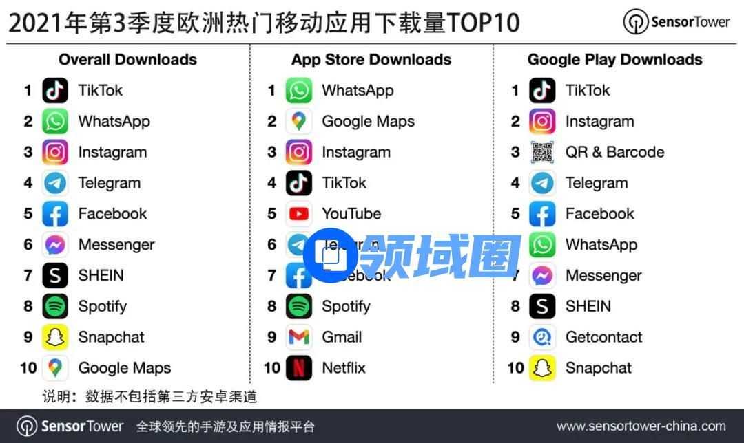 TikTok以2420万次下载位列第3季度欧洲移动应用(非游戏)下载榜榜首;Facebook旗下WhatsApp和Instagram分列第2和第3名。