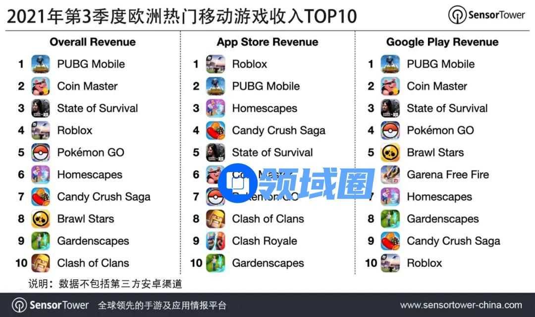 2021年第3季度,《PUBG Mobile》在欧洲市场吸金超过1亿美元,同比增长56.7%,位列欧洲手游畅销榜榜首。Moon Active《Coin Master》和FunPlus《State of Survival》分列榜单第2和第3名。