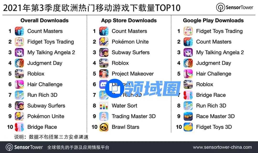 Tap2Play超休闲游戏《Count Masters》以1600万次下载位列第3季度欧洲手游下载榜榜首。Tap2Play旗下另一款超休闲游戏《Fidget Toys Trading》排名第 2, Outfit7《My Talking Angela 2》位列榜单第3名。Pokemon Company于9月22日推出的新游《Pokémon Unite》跻身榜单第9名。