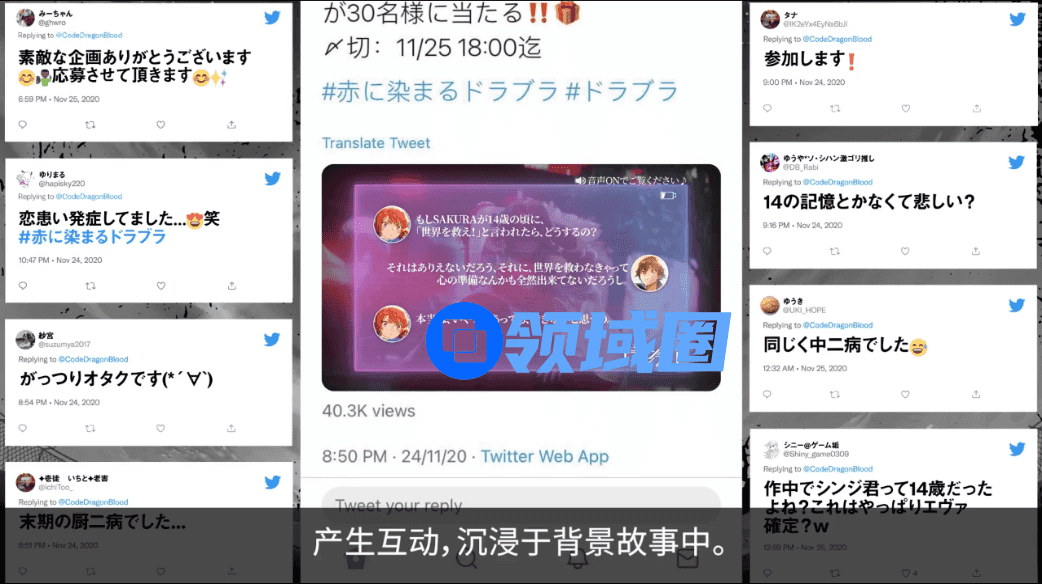 这场联动推广活动的形式相当有趣:游戏的官推主页会随着时间慢慢变成红色,仿佛是使徒来袭的时候天空变红一样。常规的“怀旧牌”在Twitter的支持下也玩出了新花样,利用Twitter的对话卡,让《EVA》声优说出角色青少年时的迷茫,这种形式让很多粉丝重新找到了中二时的自己,联动在涉谷的线下直播,整体效果自然要比单纯的线上传播要好得多。
