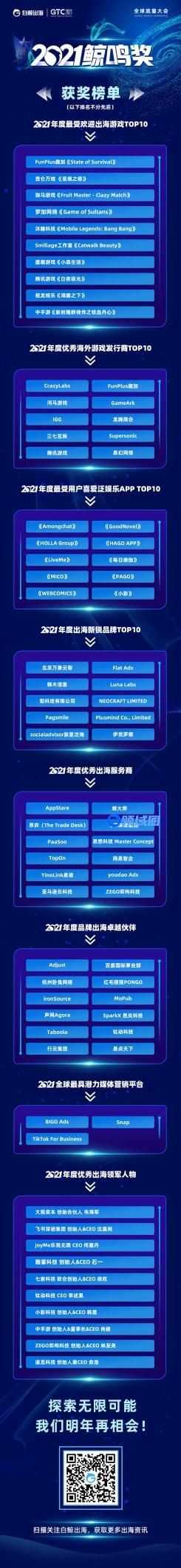 10月21日,由白鲸出海主办的第三届鲸鸣奖颁奖典礼在GTC2021全球流量大会上正式举办,本届鲸鸣奖共设置8大奖项,覆盖游戏、泛娱乐、营销、出海服务等多个领域。累计报名企业超300家,历时近35天的评选投票,最终有77家企业&个人获奖,摘得桂冠。