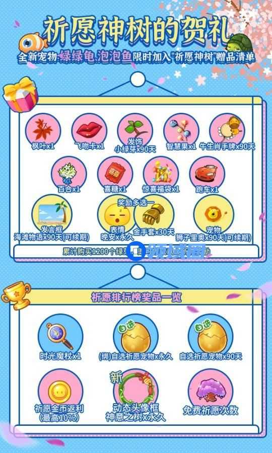活动期间,全新宠物:绿绿龟、泡泡鱼限时加入“祈愿神树”赠品清单!根据您在“祈愿神树”购买绿芽的数量,领取神树的贺礼!并且还将对小伙伴们购买绿芽的数量进行排名,在活动结束后,为排行榜上前100名玩家发放奖励!