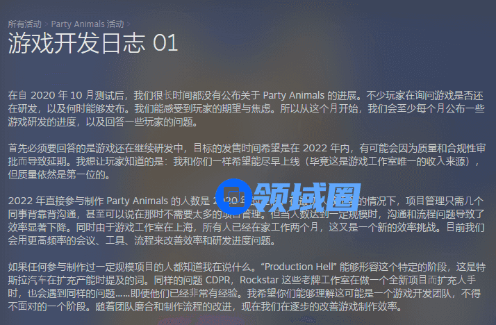 近日,沉寂许久的国产游戏《动物派对》突然发布了一则官方开发日志,表示游戏正在紧锣密鼓的开发中,目标是争取在2022年内发售,不过考虑到质量和合规性审批等原因,可能会有延期。此外,从本月开始,之后每个月还会公布一些游戏研发进度,回答玩家一些问题。