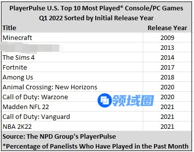 市场研究机构NPD公布了2022年第一季度最受美国玩家欢迎的10款游戏,其中位居榜首的游戏是《我的世界》,《使命召唤》系列的两款作品《使命召唤:战区》和《使命召唤:先锋》都成功上榜,而近段时间大热的《艾尔登法环》则位居第20名。