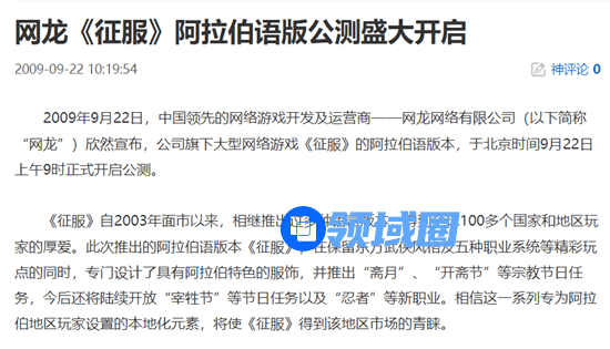 2009年时,网龙在中东地区发行了自家老游戏《征服》,意外地打开了阿拉伯语市场了,成为中国厂商拓荒阿语市场的起点。据了解,当时《征服》每个月都能有几十万美元的流水。因此网龙乘胜追击,成立了海外事业部,主要负责阿语市场。时至今日,网龙的教育业务在阿语市场依然做得不错。