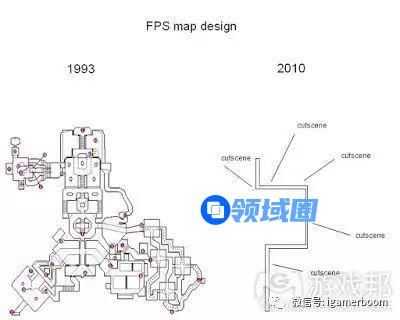 实际上的情况跟上述并不完全相符,不过却跟下面这幅比较了FPS老派设计与现代设计的图片有着惊人的相似:
