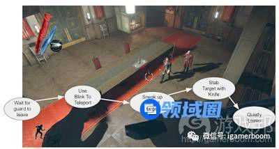 假设玩家要在这个场景里刺杀红色衣服的男人。这里玩家不会只是跳下去然后求老天保佑,他们会需要有一些行动前的计划。他们也许一开始会先等待,等到护卫离开,然后瞬移到杀害目标身后,悄然无声地完成刺杀,等完成这些动作后,再用同样的方式离开——这就是玩家在行动前脑海里的活动。他们在没有某些计划之前是不会行动的。