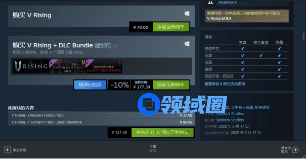 《V Rising》已上线steam抢先体验,需要购买后才可以游玩,目前steam国区售价70元,还有两个DLC拓展包,以及一个捆绑包。