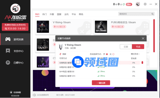 以上就是此次分享的内容,作为一款吸血鬼题材的游戏,游戏上线就引来一大波玩家进行游玩,但是游戏刚上线人很多,很容易造成服务器拥堵,导致链接失败,今天给大家带来两款白嫖加速器-AK加速器and野豹加速器。这两款加速器都已支持《V Rising》的加速器,让大家在游玩的时候不再遭受断线苦难。