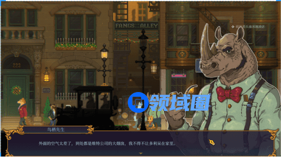 飞叶:比较偏向《疯狂动物城》的世界观。世界观会很大,更多信息会放在和角色对话以及角色介绍里,这作出现的角色也可能在未来作品里出现。这里面动物有作为人的表现,比如人和宠物之间的关系,游戏里也有鸟栖先生和他的犀牛鸟,杜林警察和它用于骑行的突突鸟。但考虑到全年龄向,故事不是要探讨很深的社会性话题,主要还是一个偏向娱乐化的故事。