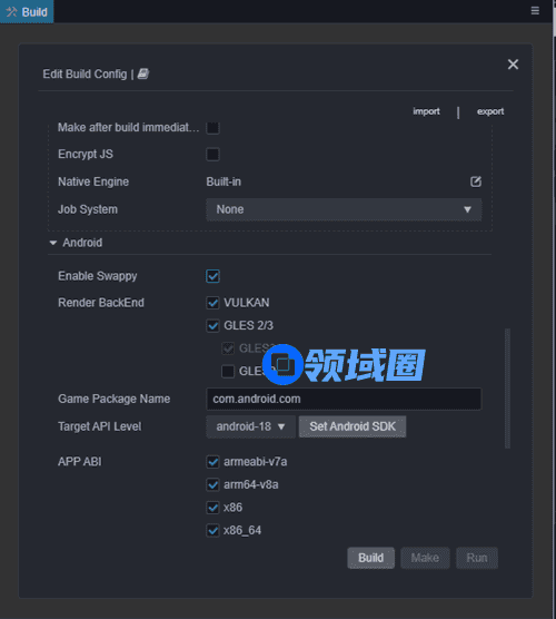 在v 3.5中,Cocos引入了Google在Android Game Development Kit (AGDK) 的重要能力Frame Pacing Library,这主要是用于帮助游戏平滑和稳定帧率,对于对OpenGL或Vulkan后端都适用,开发者可以在Android构建面板中启用Swappy来开启此功能。