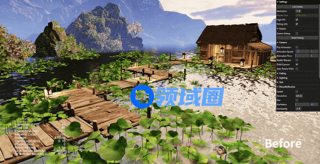 如加入了延迟管线下复杂的反射采样,让整个画面更加自然、真实;又如加入了FSR超分结合TAA抗锯齿,以低功耗渲染出更高清晰的画面,同时又不会有明显锯齿;还集成有bloom、SSAO等后处理方式去模拟真实光影效果,让湖面呈现波光粼粼的效果。
