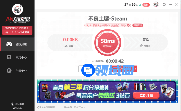 游戏中出现卡顿 掉线 延迟高 或是闪退进不去游戏的情况,可以使用AK加速进行网络优化。AK加速器每天14个小时免费时段加速,非免费时段也是时长计费制的,随用随停,性价比极高。而且支持上千款游戏的加速,主流的平台都是免费加速的。非常的好用。