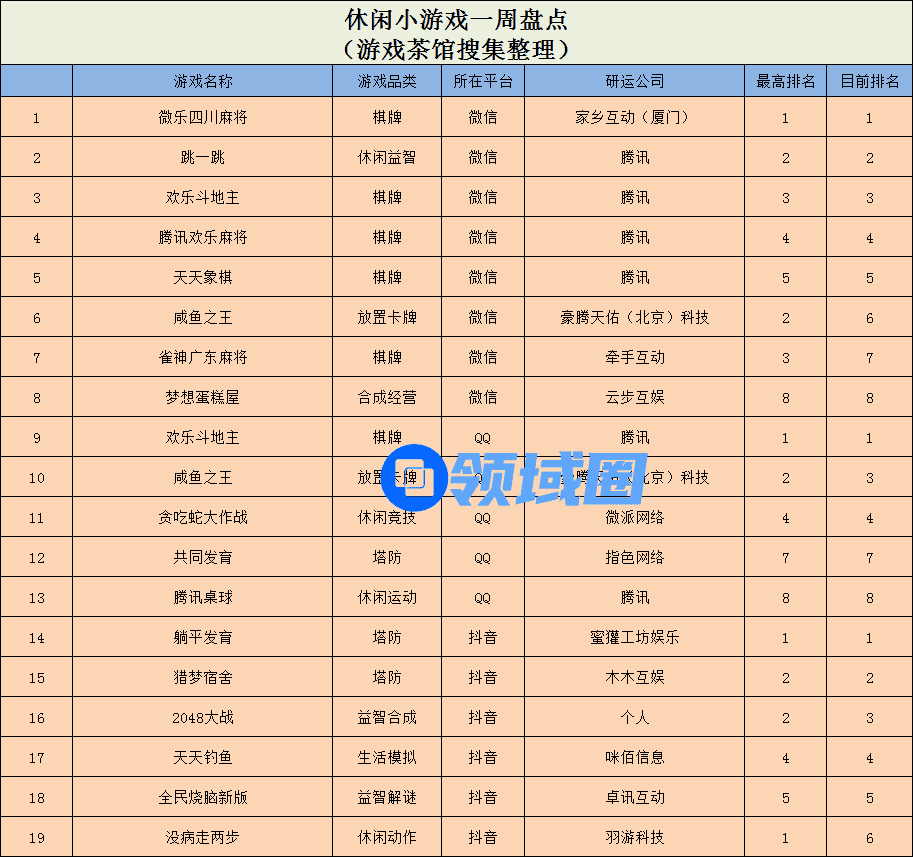 微信重度小游戏榜单中,米娅信息的竞技对战游戏《塔防精灵》登顶榜首,来自蜂虞网络的战争策略游戏《三国群将传》和星辉天拓互动的卡牌游戏《兽兽军团》则分别位于榜单第2名和第3名,且两款游戏当前分别位于微信小游戏综合榜单第18和第22名。