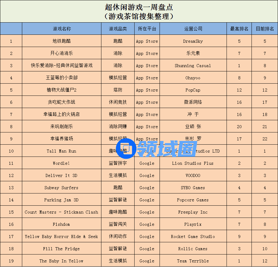 超休闲游戏方面,在App Store免费游戏榜单中,经典跑酷游戏《地铁跑酷》拿下魁首位置;Google Play免费游戏榜单中,Playrix出品的益智类游戏《Fishdom》当前位列榜单第8名。